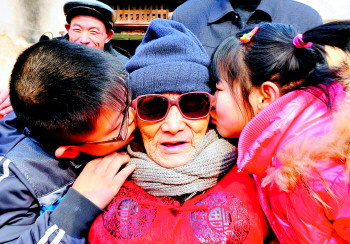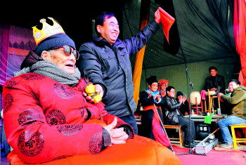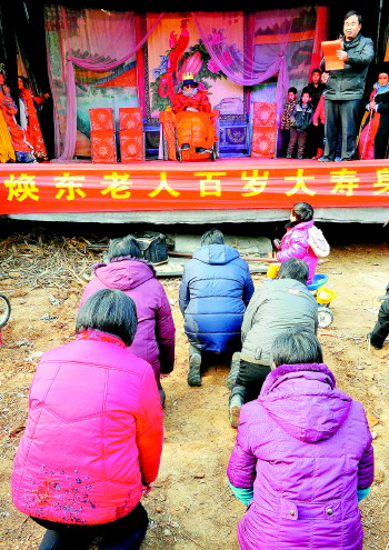 女儿们按照当地风俗给老人磕头拜寿。