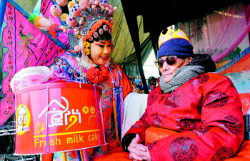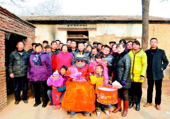 梆子戏演员给老人买来礼物祝寿。