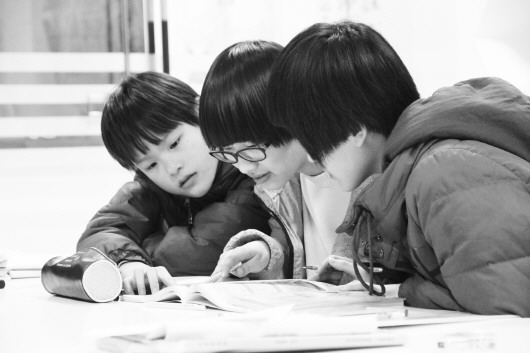◥2月5日晚,孩子们在乐安社区文化中心一起讨论文化课难题。