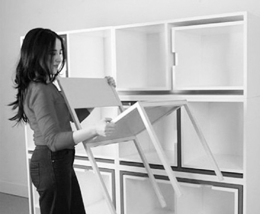 【图2】一组嵌入椅子的储物柜,简约又透露着小资气息,平时可做装饰,客人多时可拿出来用。