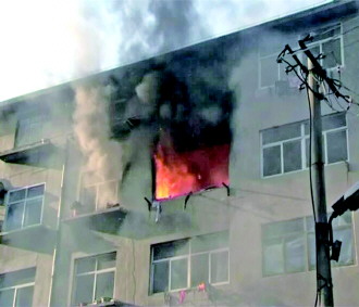 到达现场,消防队员发现起火处位于居民楼东侧1单元的4楼西户,火势凶猛,明火随着浓烟从窗户冒出,窗户已被烧掉,浓烟遮住了5楼窗户。