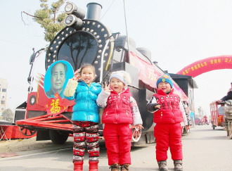 15日,在薛城元宵灯会上,小朋友在火车造型的花灯前留影。