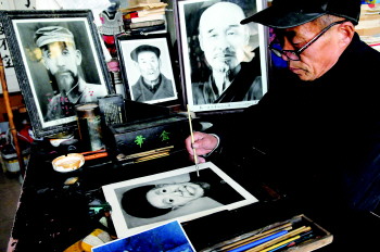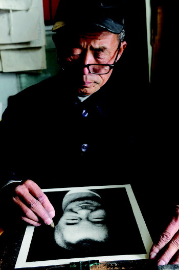现在,随着摄影技术的发展,炭精画这一技艺已逐渐淡出人们的视野,上门来找李金铎画像的人很少,李金铎主要靠恢复老照片和接一些手工雕刻的活儿来维持着自己的画室,坚持着对炭精画像的不舍与执着。