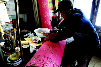 李金铎在为客户雕刻牌匾。为维持画室经营,李金铎常常要接一些手工雕刻的活儿。