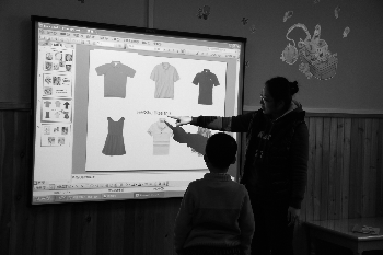在老师的指导下幼儿在认识简单的英语单词。