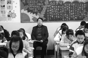 市实验中学校长程德权在课堂上与学生一起听课。