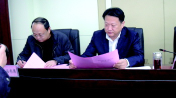 菏泽市城乡建设局局长王乃光(右)与相关单位代表签署2014年度全市建筑企业养老劳动保证金管理目标责任书、建筑施工安全生产管理目标责任书。 本报记者 张建丽 摄