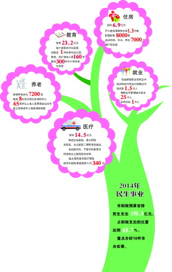 着力改善民生,促进社会事业健康发展。坚持保基本保公共保普惠保均等,实施基本公共服务体系建设行动计划,努力让发展成果更多更公平惠及城乡居民。市财政预算安排民生支出198.3亿元,占财政支出的比重达到65.7%。重点办好10件市办实事。