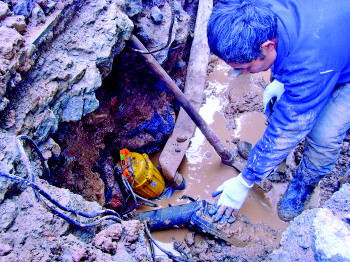 ◥维修工人正在寻找爆裂管道的漏点。