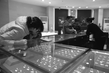 目前,国际金价行情低迷,投资需谨慎。金饰品虽没有投资价值,但刚需需求较大。图为20日市民在金店选购金戒指。