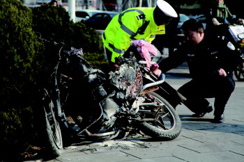 摩托车已被烧得面目全非。 本报记者 孙慧瑶 摄
