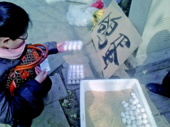 “鸽子营养价值高,3.5元不贵。”蔡先生有一个占地3亩的鸽子棚,养了3000对种鸽,他家的鸽子蛋主要销往南方,因为这两天在家闲着,就带了一箱鸽子蛋想在城区挣点钱。