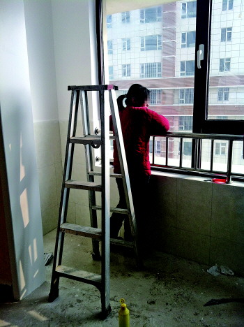 一只脚踩着梯子,另一只脚踩在窗台上,对保洁员来说,擦玻璃是他们最重要的活之一。