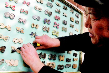布建芳将选好同类别的纽扣固定在展板上。