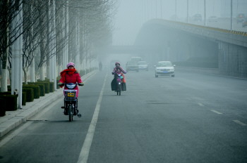 路上的行人戴上口罩以躲避雾霾。