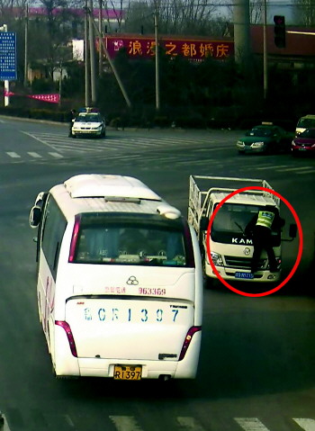 同在该路口执勤的其他民警见此情形,立即驾驶警车沿肇事车辆行驶方向追赶。途中,趴在轻卡车上的交警大声责令轻卡车驾驶员立即停止其违法行为,该驾驶员竟然喊道“我今天就是喝了不少酒,你们交警怎么处理我都可以!”并继续向南狂奔。