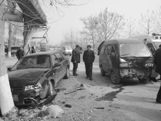 2月24日下午一点多,在枣庄市市中区郭里集枣庄市十三中学附近,一辆小轿车和一辆面包车相撞,面包车司机面部受伤,被紧急赶到的120救护车救走,其他人员没有受伤。 本报记者 李泳君 杨兵三 摄影报道