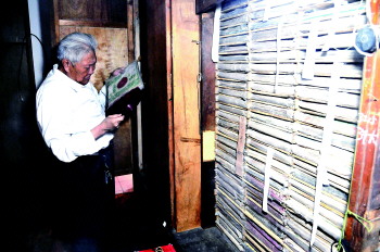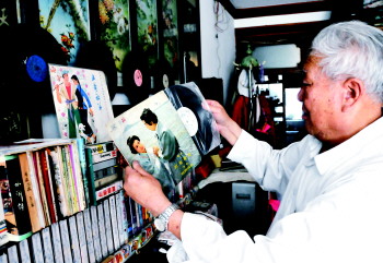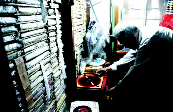 陈德芳今年73岁,收藏老唱片已经58年,现在家中收藏有近两万张老唱片,每张都是他的心头肉。“从我记事起,父亲的杂货铺就有一台留声机,一边叫卖一边放唱片,打小我就喜欢听。”陈德芬说,15岁时他进入电厂工作,发了工资就会去百货公司买唱片,每次买到新唱片,喜悦之情现在回忆起来依然十分激动。“小唱片三毛,粗纹唱片一块,细纹唱片两块四,这是当时的统一定价。”陈德芳说,随着社会的发展,录像制品开始普及,唱片越来越少了,他就开始用唱片刻录机制作电视唱片,也会到古玩市场寻找中意的老唱片。