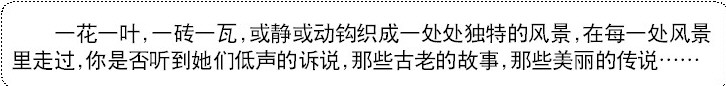 一花一叶,一砖一瓦,或静或动钩织成一处处独特的风景,在每一处风景里走过,你是否听到她们低声的诉说,那些古老的故事,那些美丽的传说……