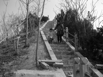 一名家长牵着小孩从护栏破损的台阶上下来。 本报记者 王瑞超 摄