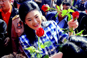 27日,泰国看守总理英拉亮相家乡清迈,获支持者献花。