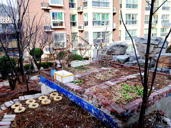 “这片种的地瓜、白菜,那一片是菠菜、茄子。”军安和平山庄19号楼的西侧,一位大爷带着自己的孙子忙活在一片大约五六平米的菜地上。“每天在家除了带孙子也没啥事,就把这块地利用起来种点菠菜。自己种的菜不怕有农药残留,吃着放心,哪家邻居想吃,也可以随便摘。再说了,这和绿地一样,也能起到美化环境的作用啊!”