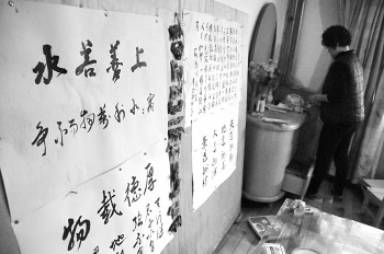 孙永昌的家属正在收拾他的房间,墙上贴着他生前写的“厚德载物”“上善若水”。
