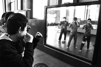 散打运动员利用镜子练习姿势。