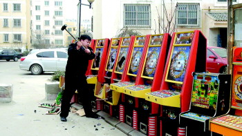 26日,德城公安分局对“黄赌毒”专项整治行动以来所缴获的10台赌博机进行了集中销毁。