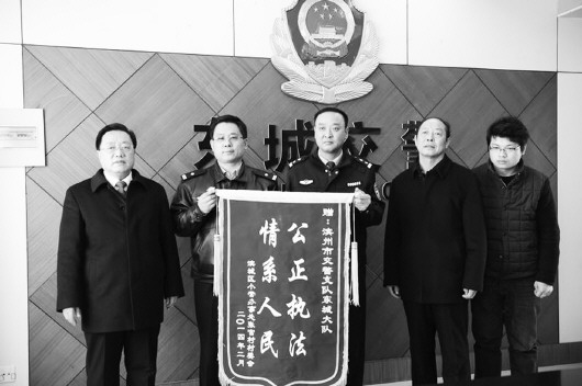 2月27日,三位交通事故受害人家属将一面题为“公正执法 情系人民”的锦旗送到滨州市公安局交警支队东城区大队事故处理民警邢海政手中,表达对东城交警在道路交通事故处理过程中刚正不阿,公平公正,全心全意为人民服务的感激之情。