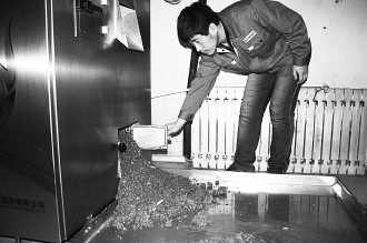 ▲在塔山宾馆餐厨弃物处理站,工作人员正收集生成物,黄色生成物可被用作饲料或有机肥。 记者 王帅 摄