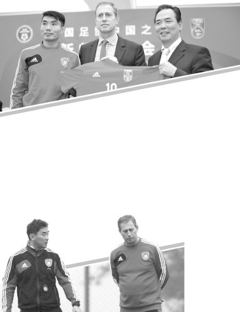 足协主席蔡振华(右)与佩林共同展示中国队球衣。新华社发 刚一上任,佩林便与代理主教练傅博交流。 Osports供图