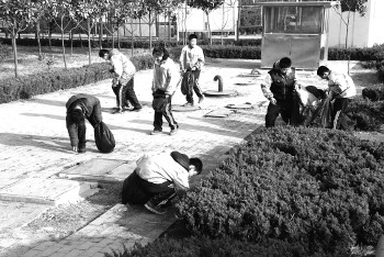 清理任务分配好后,60多名同学分散到了小区广场、楼道、绿化带中,有的同学用扫帚扫地,有的同学用手捡垃圾,有的同学对广场公共设施进行清洁。