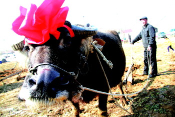 尽管还是春寒料峭,但是依然挡不住人们闹春牛的热情,参加活动的村民一大早给牛备足了饲料,并在牛头上挂上了红花,希望能获得好成绩。