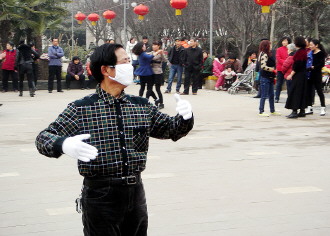 时间:2014年2月23日 自述:广场上,一位先生戴着口罩独自跳舞。 点评:看来空气质量不好,雾霾有点重。