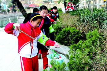 3日,济南市天成路小学“雏鹰义工小队”16名队员上岗后,佩戴袖标,拿着工具,徒步沿东工商河捡拾垃圾,开始了首次环保活动。
