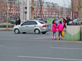 在双山大街与鲁宏大道路口,两名小女孩穿着轮滑鞋过马路,由于正值上下班高峰期,交通十分繁忙,而穿轮滑鞋上街显得十分危险。 本报记者 赵克 摄