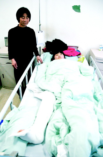 3日,12岁的王雪晴躺在病床上,右腿缠着厚厚的绷带,翻看着喜欢的《探秘科学》图书。8天前,在收衣服时,他失足从家中的房顶摔下,导致右腿两处骨折。雪晴摔伤后,学校师生自发为雪晴捐了1600多元。现在采取的是保守治疗,如果效果不理想的话,下一步还将进行一个手术。这些医疗费用咋出,现在还没有着落。