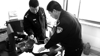 ◤民警正在对比车体碎片。本报记者 路帅 摄