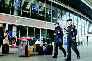 3日,在烟台火车站,全副武装的特警正在巡逻。据了解,青岛铁路公安处特警支队、芝罘公安分局特勤中队升级安保措施,增派特警、武警持枪执勤,24小时不间断武装巡逻。图为青岛铁路公安处特警支队官兵在烟台站巡逻。