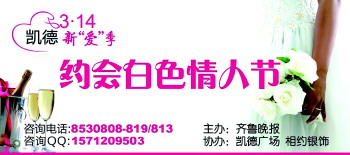 本报3月2日讯(记者 李晓东)2月14日,本报联合凯德广场举办了“凯德星之恋”情定2·14相亲会。3月14日,恋爱季再来袭,本报将继续携手凯德广场举办3·14新“爱”季单身派对,与单身男女们约会浪漫白色情人节。