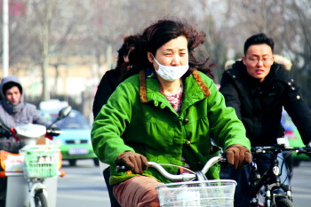 3月3日,市区出现大风天气,气温有所下降。在湖滨大道,骑自行车的市民睁不开眼。 本报记者 王小会 摄