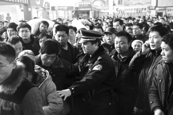3日,德州火车站安检升级。在火车站候车厅内,身穿制服的民警在进行安全疏导。 本报记者 王小会 摄