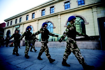 3日,在青岛火车站,全副武装的武警官兵在火车站广场、售票亭等地进行武装巡逻。自3月1日晚,昆明火车站发生暴力恐怖袭击事件后,车站安保问题引发关注。据介绍,青岛特警、武警和其他警种以及协警等社会力量,分不同时段在人员密集场所坚持巡逻防控。
