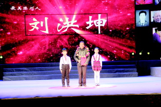 刘洪坤的父亲站在领奖台上。 本报记者 张冬梅 摄