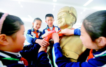甸柳第一小学,孩子们给雷锋像戴上红领巾。雷锋虽已远去,但雷锋精神将代代相传。 本报记者 左庆 摄