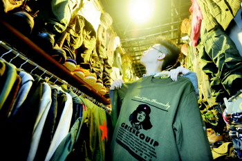 山师东路商业街一店内,一件印刷有雷锋头像的T恤吸引了年轻人的注意。雷锋也许并不时髦,但却是不少人心中的偶像。 本报记者 左庆 摄