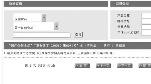 记者在淘宝网打上“减肥产品”几个字搜索结果显示多达2.04万件,其中排在第一位的就是天猫商城一家赛美食品专营店在售的“华美姬牌左旋肉碱健康瘦身瘦腿胶囊”。该产品无论是人气、销量还是综合指标都是处于第一位,网上显示目前销量已经达到了7万多件。产品介绍显示,厂家是江西维莱营健高科有限公司,另外该产品是经过国家监督管理部门认证的,批准文号为“卫食健字(2001)第0085”。然而记者在国家食品药品监督管理总局的网站上查找该批准文号,对应的产品竟然是该公司生产的另一种产品“哈贝高牌信力态胶囊”,并不是“华美姬牌左旋肉碱健康瘦身瘦腿胶囊”。