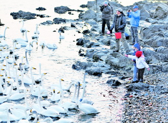 随着天气转暖,在荣成越冬的1万多只大天鹅陆续回迁西伯利亚等地。截至4日,尚未飞走的大天鹅不足300只,3月中旬将全部回迁。3月4日,不少市民驱车赶到荣成烟墩角村,给大天鹅喂食,让大天鹅吃了再赶路。