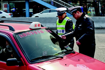 交警责令一辆“红老鼠”不得营运。本报记者 杨广帅 摄